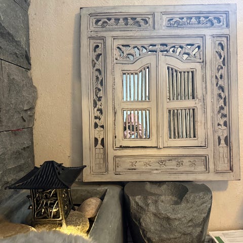 Dekorativ spegel med kraftig träram och utskurna detaljer. Har öppningsbara fönsterluckor med spjälor som ger en fin fönsterkänsla på väggen. Finns att köpa på Näset i Västra Frölunda/Göteborg