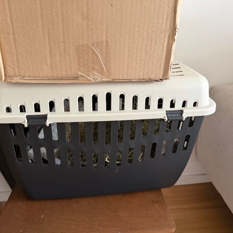 Blå mjuk transportbur med nät på sidorna och dragkedjor i öppningarna. Har bärhandtag upptill och förstärkta hörn i svart tyg. Hopfällbar