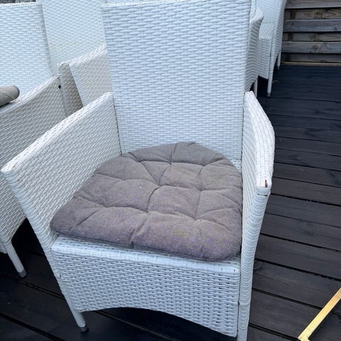 Två grå stolar i konstrotting med armstöd. Stadiga metallben och skön sittform, bra till balkong eller altan.