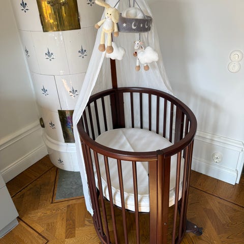 Säljer en fin Stokke Sleepi spjälsäng i gott begagnat skick. Stabil och praktisk säng med den klassiska ovala formen.