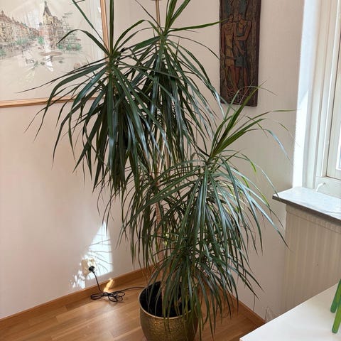 Stor grön krukväxt i lerkruka, fin som golvväxt i ett hörn. Flera stammar och tätt med blad som ger mycket grönt i rummet.