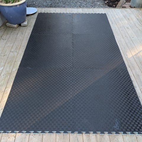 Svarta pusselgolv/träningsmattor i gummi som läggs ihop bit för bit.