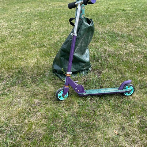 Grå sparkcykel med gröna hjul och detaljer. Stadigt styre och fotplatta med mönstrat grepptejp. Perfekt sparkcykel för dig som vill åka runt och kanske lära dig några tricks