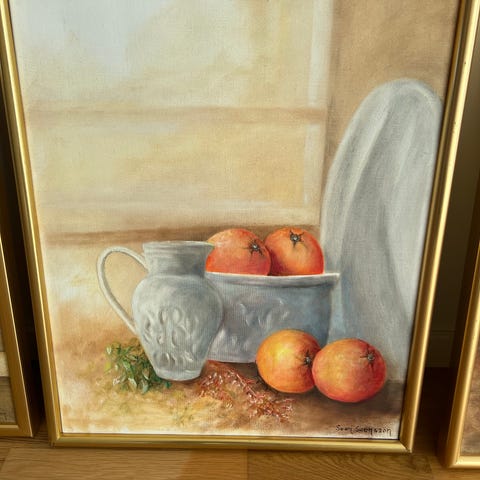 Fin tavla med stillebenmotiv, frukter i skål mot brun bakgrund. Sitter i en enkel guldfärgad ram, redo att hängas upp på väggen.