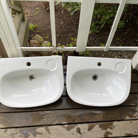 Vitt tvättställ från lfö med rundad skålform 57 cm. Hål för blandare och avlopp i mitten, kant runtom för att ställa saker på. Helt okej