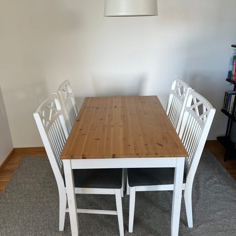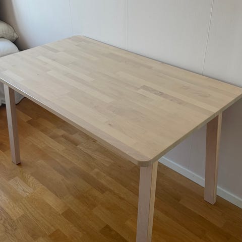 Norråker. Massiv björk, bets, klar akryllack. Längd 125 cm, bredd 74 cm, höjd 74 cm. Mindre risk för barn att slå sig då bordet har runda hörn.