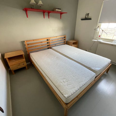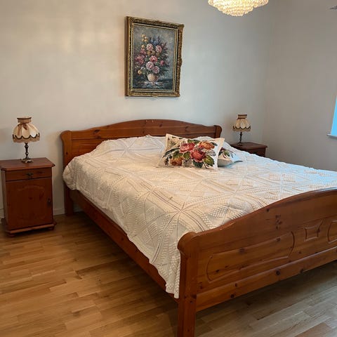 Stabil träsäng i furu med hög gavel och två resårmadrasser. Matchande sängbord i samma stil med låda och skåp för förvaring.