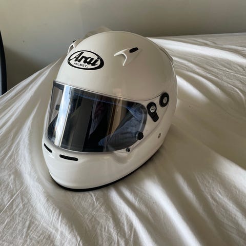 Arai integralhjälm i stl M (57–58 cm) i svart och vitt med visir. Har snabbspänne under hakan och vadderad insida med blå/grå kuddar.