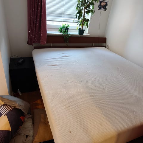IKEA-säng med resårbotten och vit bäddmadrass, stående på mörka ben.