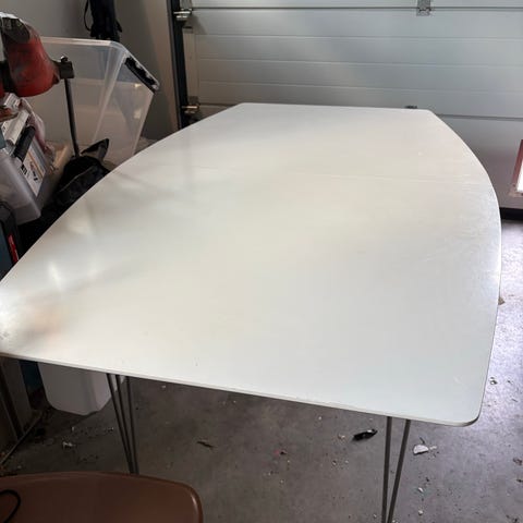 L 160 B 90 (som bredast) H 87. Iläggsskiva (fästes undertill på ena kanten) ger extra 40 cm.