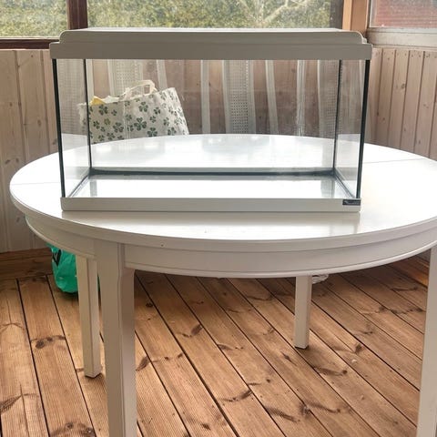 Glasbotten, och långsidor i glas. Träskivor på kortsidorna.