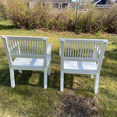 Vit trädgårdsgunga i trä med ribbad sits och rygg säljes tillsammans med matchande stolar och bord. möbelgrupp som passar bra på altan eller i trädgård.
