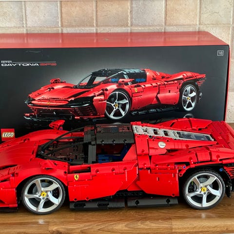 LEGO Technic Bugatti Chiron 42083. Byggsatsen innehåller en detaljerad modell av Bugatti Chiron med fungerande växellåda, motor och rörliga delar. Modellen är i skala 1:8 och har en autentisk blå färgskala. Instruktionsböcker och originalkartong medföljer.