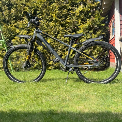 Utrustad med framgaffel med dämpning, skivbromsar och mönstrade däck för bättre grepp. Väldigt lite använd.