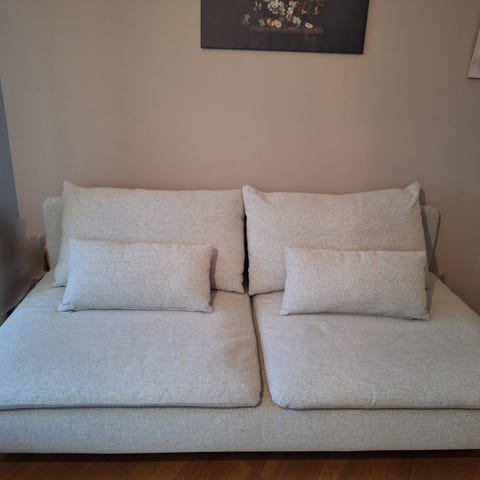 Söderhamn soffa, 3-sits. Neutral färg. Katt har funnits i hemmet, dock är soffan i bra skick och tvättad. Inga märken.