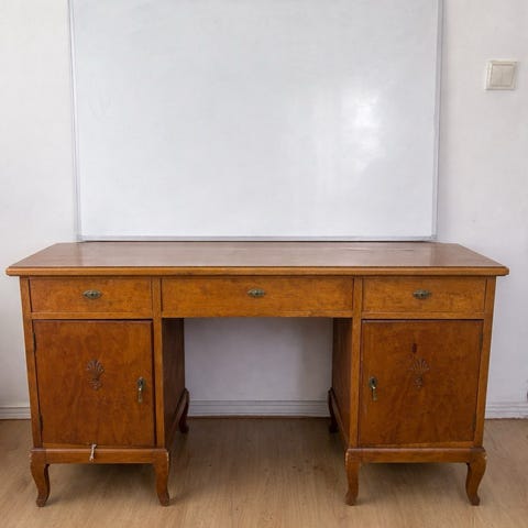 Skrivbord av okänd tillverkare och träslag med utdragbara lådor och förvaring. Betsat trä.