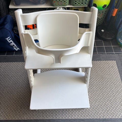 Vit Stokke Tripp Trapp matstol med justerbar sitt- och fotbräda. Har bygel och sele som enkelt kan tas av och på.