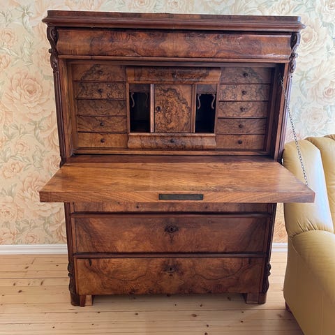 Väldigt gammal chiffonje i fint träslag. Fattas dock nyckel så hyllan kan bara vara nedfälld. Väldigt tung! Avhämtning sker enligt överenskommelse.