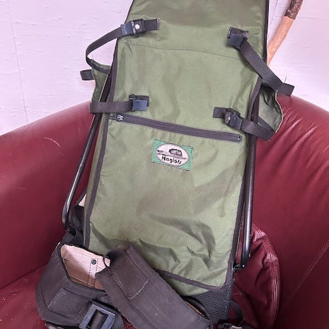 Haglöfs Svart bärstol/bärstolryggsäck för barn med justerbara remmar. Har vadderat säte och flera spännen för att kunna ställa in passformen. Ett spänne saknas men enkelt köpa