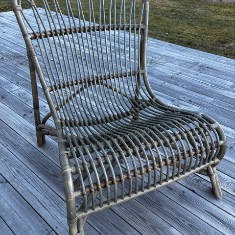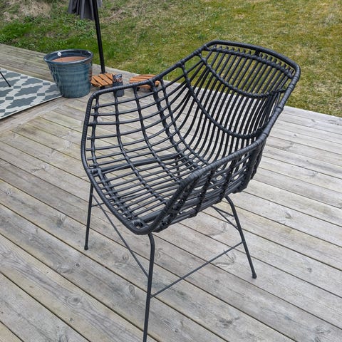 Skön rottingfåtölj i svart med lös, vadderad sittdyna i vitt. Passar bra på altan eller uteplats med sin luftiga rygg och armstöd.