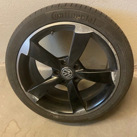 Säljer en uppsättning 19-tums fälgar med sommardäck som suttit på en Volkswagen. Snygg design i svart och silver. Hjulen har förvarats mörkt och svalt i källare när de inte suttit på bilen.