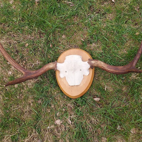Stor jakttrofé med älghorn på träsköld. Med upphängning.