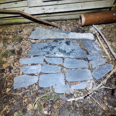 Stapel med skifferplattor i olika storlekar, bra för gång, uteplats eller mur. Se måttstocken på bilderna för ungefärlig tjocklek och storlek på plattorna. Totalt ca 5-7 m2