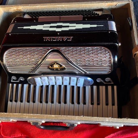 Hagstrom Excellent 25 dragspel i svart med pianoklaviatur och basknappar. Fina detaljer på fronten och remmar för att bära det bekvämt.