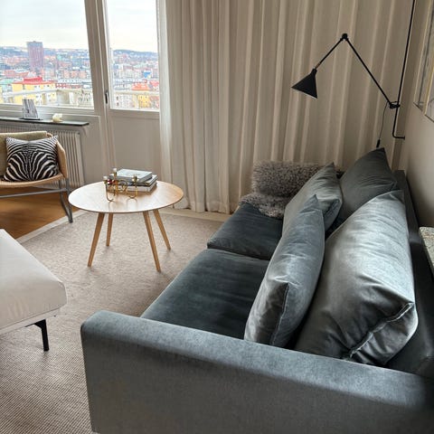 Soffa i grå sammet, Chesterfield-stil. Färgen är ljus-/mellangrå.