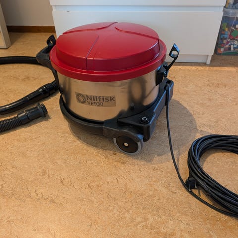 Nilfisk AERO 26 grovdammsugare i blått med lång slang och rör. Har hjul, bärhandtag och bred munstycke framtill som gör den smidig att flytta runt på golvet.
