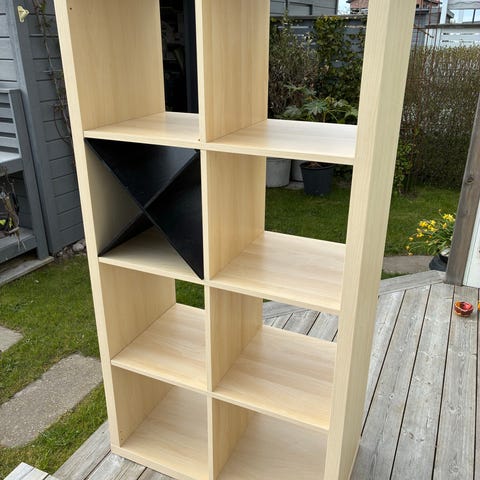 Vit hylla från IKEA med åtta rymliga fack. 77*147 cm. Kan placeras stående eller liggande och kan fungera som rumsavdelare. Passar bra för leksaker, böcker eller annan förvaring.