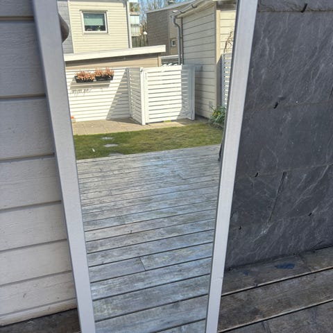 Stor helkroppsspegel från IKEA med aluminium ram. Passar bra att ställa mot vägg hänga på vägg eller hänga upp lodrätt på vägg