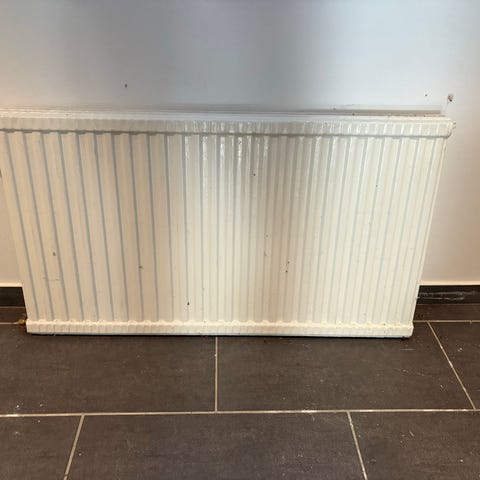Vitt vattenburet element, mått ca 50x60 cm, med anslutningar och termostatventil. Två väggfästen följer med som syns på bilderna.