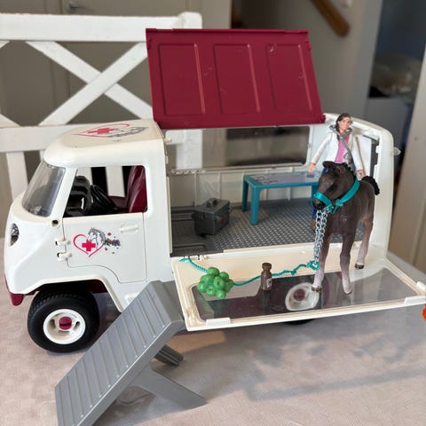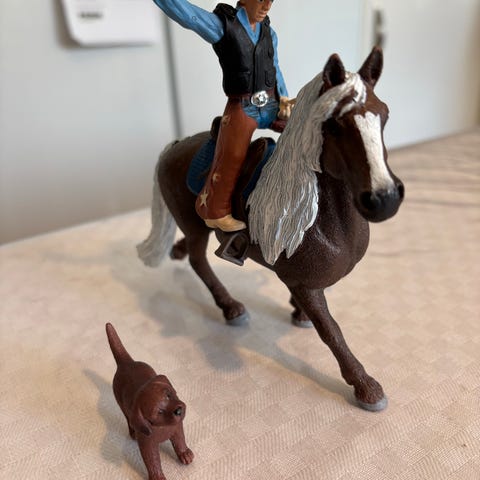 Söt liten leksaksfigur som rider på en häst, med en liten pall bredvid. Perfekt till barnens hästlek och passar bra ihop med andra små figurer.