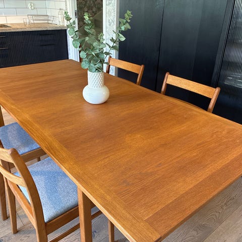Trädgårdsbord i teak med iläggsskiva. Stadigt men ändå ganska lätt för att vara ett träbord. Säljes nedmonterat.