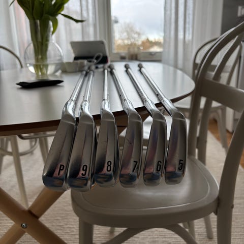 Srixon Z965 järnset pw-j5. ”lättslagna bladklubbor”. Relativt bra skick, en skada på Pw men endast kosmetiskt. Stiffskaft