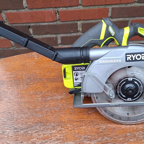 Ryobi RPLS18X 18V sänksåg med justerbart sågdjup och skala på sidan. Bekvämt handtag och anslutning för dammutsug, fungerar med Ryobi One+ batterier.