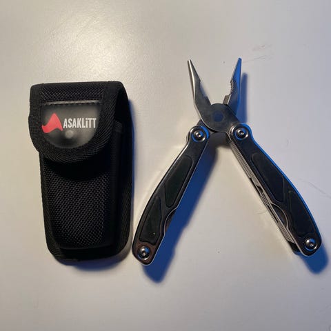 Multifunktionskniv i metall med utbytbara blad. Kniven har en säkerhetsspärr och levereras med en förvaringslåda i metall samt extra blad.