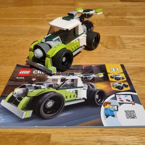 Tre LEGO-set: två Creator 3-i-1 med bil och flygplan samt ett City strand- och livräddarset med figurer. Fina kartonger med tydliga bilder på modellerna och vad man kan bygga.