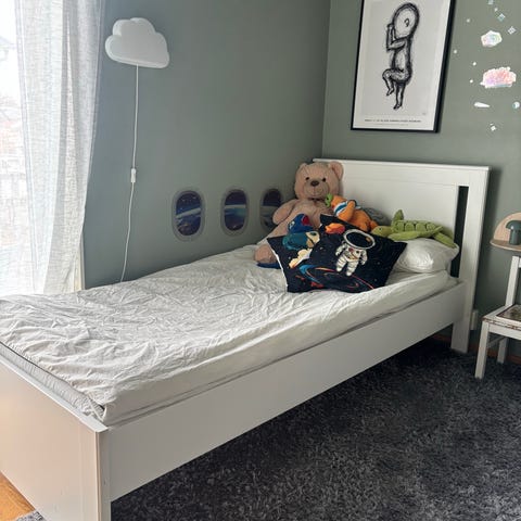 Säljer vår fina golvsäng, vi köpte den men det slutade med att den aldrig användes då vi valde att fortsätta samsova. Den är alltså monterad men har aldrig använts. Den är köpt för 2000kr på amazon vid slutet på 2025, märke EcoMi. Säljs tillsammans med madrassen som är från Ikea, också helt oanvänd.