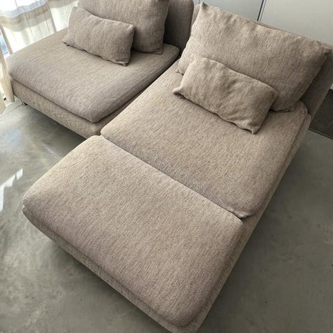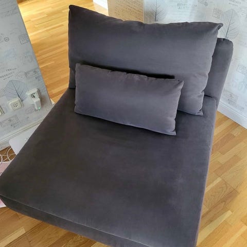 Rymlig liggfotölj som kan användas som bäddsoffa för en lite mindre person. Väldigt skön dyna tack vare äkta dun. Dragkedjan på dynan har gått sönder men man kan stänga med andra medel om man tex vill tvätta överdraget.