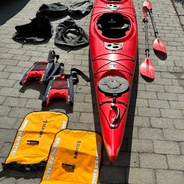 Forskajak, paddel, spraydeck, kastlina, flytpåsar