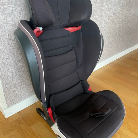 Bilbarnstol i svart med fempunktsbälte och justerbart huvudstöd. Har sidokrockskydd och tydliga bältes- och monteringsanvisningar på sidan.