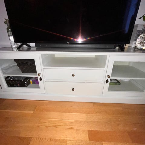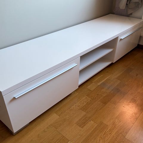 Vit tv-bänk med höglansinga luckor och utdragbar låda. Bra skick men två mindre märken finns i två av hörnen (se bilder). Tillverkad i Danmark. Finns för upphämtning i Österskär.