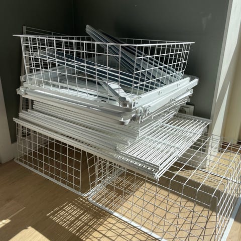 Trådbacksstapel, 2 st, 4 trådbackar, 45 cm bred och 54 cm djup, färg silvergrå med vit toppskiva