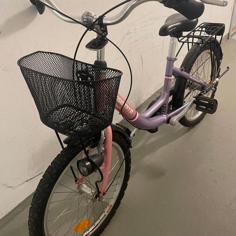 Cykeln har lila ram med lågt insteg. Utrustad med cykelkorg fram, pakethållare bak, reflexer i hjulet, stänkskärmar, kedjeskydd, fotstöd, fotbroms bak och handbroms fram.