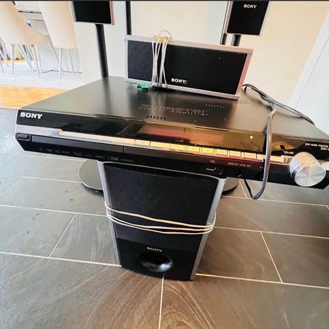 Sony hemmabioreceiver med flera ljudlägen och tydlig display på fronten. Baksidan har gott om anslutningar för högtalare och olika ljud- och bildkällor. Antenn och fjärrkontroll. Allt fungerar.