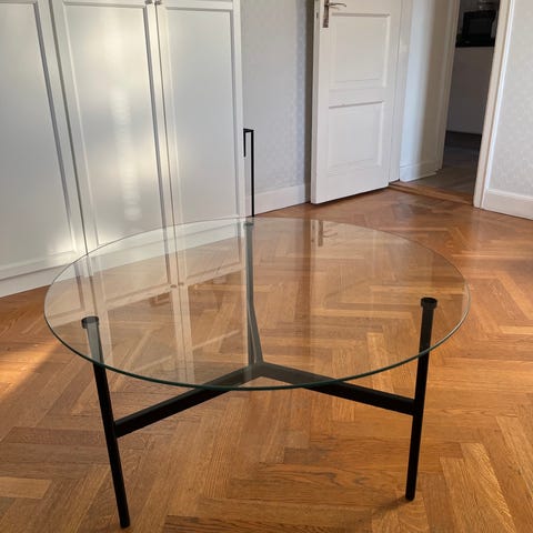 Soffbord från Mio med runt glasskiva och svart metallstativ. Skivan är lätt tonad och underredet har kryssformade ben som ger ett luftigt intryck. Fint skick. Nypris 1295.