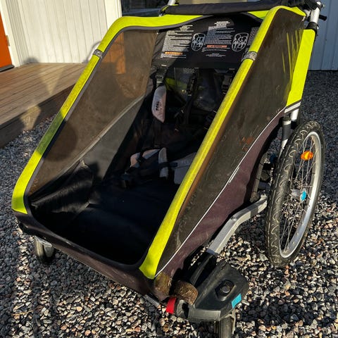 Multisportvagn Thule Chariot Cab 2 i bra skick med promenadhjul, cykelstång med fäste och regnskydd.