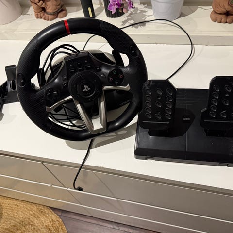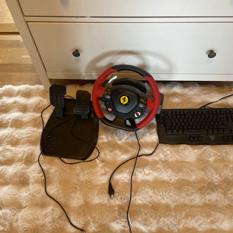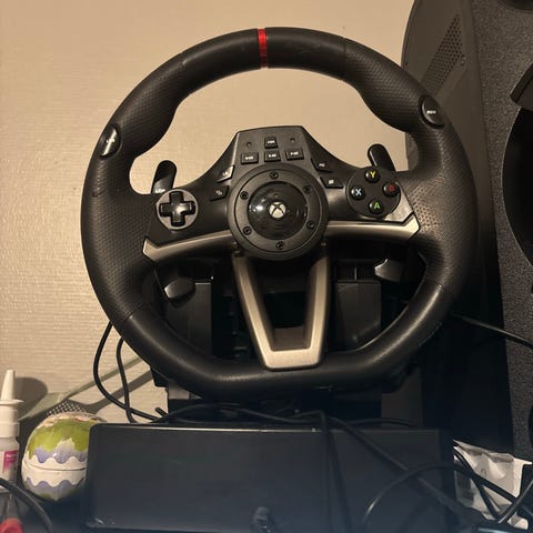En gamingratt och pendlar till Xbox med USB-A output. Föga använd och i gott skick men med synliga märken från tejp (går säkert att skrapa bort). Pedalerna har en utfällbar platta för bättre stabilitet och ratten har sugproppar undertill men de hugger dåligt tyvärr.